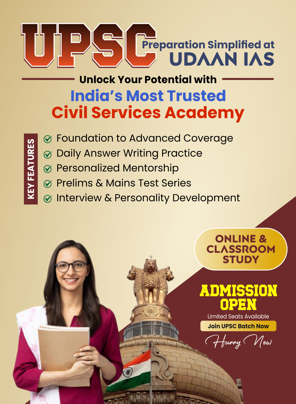 उड़ान आईएएस अकादमी ऑनलाइन/ऑफलाइन माध्यम में शिक्षण विकल्प प्रदान करती है । आप कक्षा सत्रों में भाग ले सकते हैं या हमारे इंटरैक्टिव ऑनलाइन प्लेटफ़ॉर्म के माध्यम से कहीं से भी जुड़ सकते हैं, जहाँ लाइव व्याख्यान, रिकॉर्ड की गई कक्षाएं और शंका-समाधान सत्र उपलब्ध हैं।